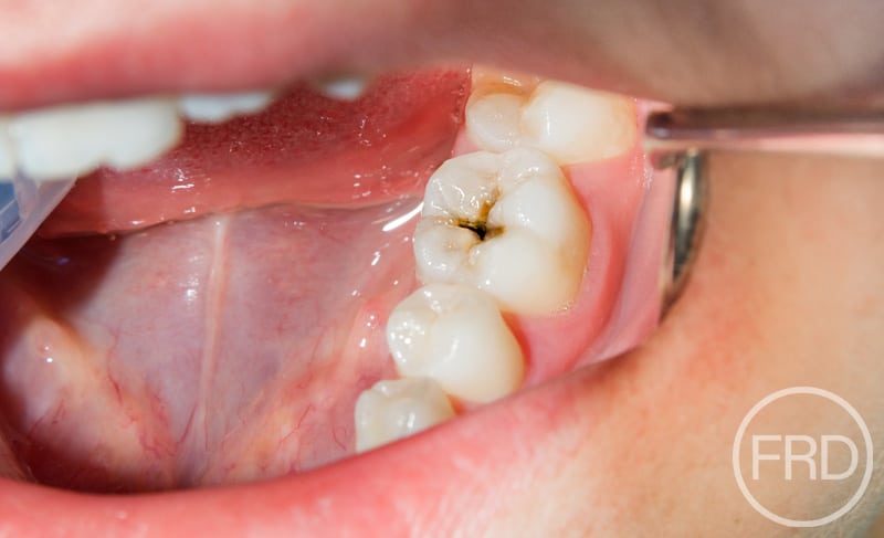 Dental decay occurs when patients expose their teeth to sugars at too high a frequency. The decay will often start as a small hole between the teeth which, if caught early, can be treated by a simple filling.